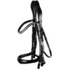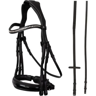 Het kopstuk en de neusriem zijn beiden zacht onderlegd voor optimaal comfort en een goede drukverdeling. De neusriem bevat een vulling van 10 mm en is aan de buitenzijde bedekt met lakleder. De gun metal-gekleurde gespen zijn voorzien van een beschermflap op de plekken waar de gesp het paardenhoofd raakt. Het licht gebogen frondeel is stijlvol afgewerkt met glanzende imitatiediamanten van Stellux™ in zilverkleurige cups. Inclusief lederen en rubberen teugel.
