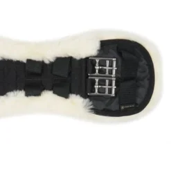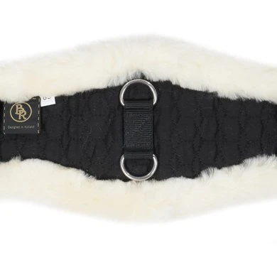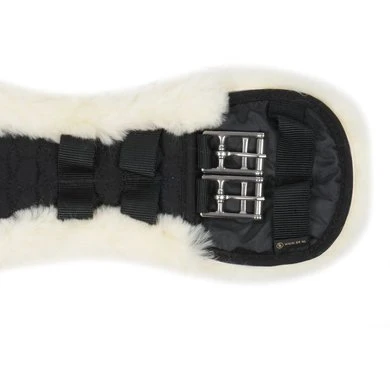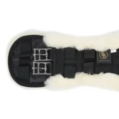 Anatomisch gevormde dressuursingel met medicinale schapenvacht. Vanwege de gebogen vorm kan de elleboog vrij bewegen, waardoor beschadigingen aan de huid kunnen worden voorkomen. Met roestvrijstalen gespen en D-ringen voor het bevestigen van eventuele hulpteugels.