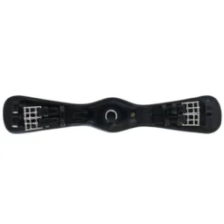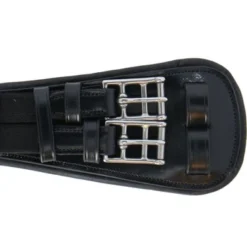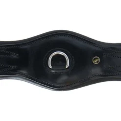 Lederen, anatomisch gevormde dressuursingel met aan twee zijden elastiek en een D-ring voor de bevestiging van eventuele hulpteugels. De singel is voorzien van roestvrijstalen rolgespen en sierstiksel.