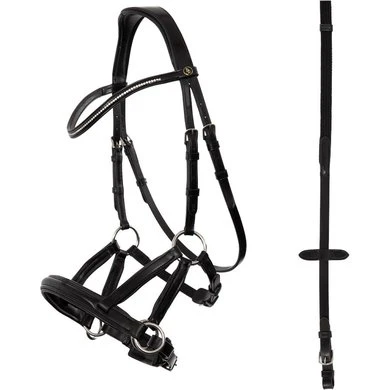 Het is gemaakt van kwalitatief Engels leder dat soepel is en goed aansluit op het paardenhoofd. Inclusief teugel met handstops en teugelstops.