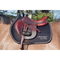 Het Therapy zadeldek heeft een wafelvoering die het zweet van het paard absorbeert, zonder het Therapy materiaal te hinderen. Verkrijgbaar in dressuur- en allround-/springsnit, met klittenbandbevestigingspunten en singellussen om het kussen op zijn plaats te houden onder het zadel en een hoge schoft/gevormde rug zorgt voor een comfortabele pasvorm.