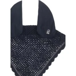 Vliegenkap van sneldrogende, huidvriendelijke functionele jersey in het oorgebied. Het linkeroor is bedrukt met het Cavallo-stijgbeugellogo.