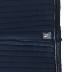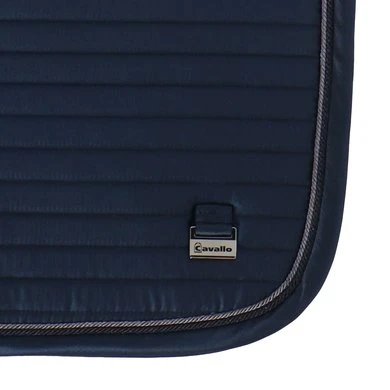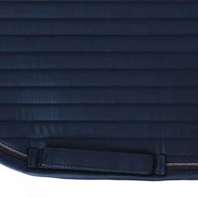 Zadeldek met horizontaal gestreept stiksel. Twee kleine, contrasterende gekleurde koorden omlijsten het zadeldek.