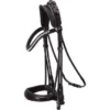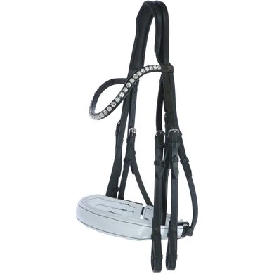 Stang en trens hoofdstel, onderlegd kopstuk, brede aansnoerneusriem met lak en wit onderlegd, frontriem gebogen met Swarovski Elements