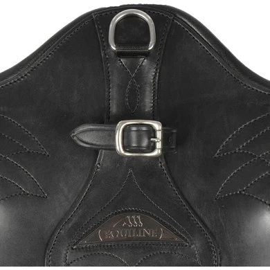 Anatomische leren studguard singel. Gesp en riem voor martingale borstsingel. Zij ringen. Stalen gespen met elastiek. Voering van kalfsleer.