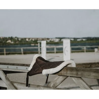 3D mesh polyester onderlegger met 10mm schuimvulling en 200g/sq.m polyfill. Klittenbanden. Voering en schoftrand van imitatie schapenvacht.