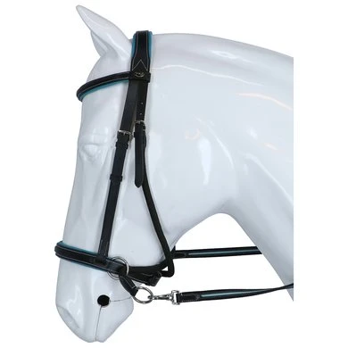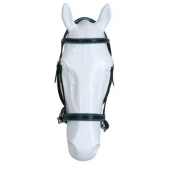 F.R.A. bitloos systeem 5: bitloze optomingen zijn niet nieuw! Eeuwenlang werd een bitloze optoming als vanzelfsprekend ervaren, voordat er ooit aan werd gedacht iets in de mond van het paard te stoppen legde de mens er simpelweg iets omheen. Een touw als halster was destijds voldoende en zo ontstond de eerste bitloze optoming. In combinatie met de ondersteunende gewichts-,been- en gevoelshulpen onderhoudt de ruiterhand via de teugels kontakt, niet met de mond, maar met het hoofd van het paard. Werkingsprincipe: druk op neus, nek èn wangen, nek/kingekruiste teugelvoering. Bouw: De lederen neusriem van deze optomingen, in de markt veelal bekend onder systeem Cook, is aan beide zijden even achter de bakstukken voorzien van een ring. Door deze ringen loopt een soepele lederen riem kruislings over de kin, via de kaken over de nek. Aan beide uiteinden van deze riem worden de gespen of clips van de teugeluiteinden bevestigd. Aan de linkerzijde van het hoofdstel vind je één gesp voor de bakstukafstelling en één gesp voor het verbinden van de kruislingse riemen. Ter bescherming van het nekgebied zijn beide riemen daar met een zachte padding onderlegd. De riemen dienen zodanig door de passanten van deze nekpadding verschoven te worden dat ze aan beide zijden gelijke lengte hebben. De gesp van de kinriem is de enige gesp die nodig is om het hooofdstel op het hoofd te fixeren. Ligging: Evenals bij de meeste bitloze optomingen geldt ook voor deze optomingen dat de neusriem op het harde gedeelte van de neus moet liggen, ongeveer daar waar het neusbeen begint. De kinriem mag gevoelsmatig ’te’ vast, maar beslist niet aangesnoerd zijn. Dit om verdraaiïng van het hoofdstel te voorkomen. De bakstukken van bitloze hoofdstellen met een kin- nekgekruist systeem zullen altijd de neiging hebben enigszins op te bollen. Inwerking: