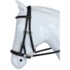 F.R.A. bitloos systeem 4: bitloze optomingen zijn niet nieuw! Eeuwenlang werd een bitloze optoming als vanzelfsprekend ervaren, voordat er ooit aan werd gedacht iets in de mond van het paard te stoppen legde de mens er simpelweg iets omheen. Een touw als halster was destijds voldoende en zo ontstond de eerste bitloze optoming. In combinatie met de ondersteunende gewichts-,been- en gevoelshulpen onderhoudt de ruiterhand via de teugels kontakt, niet met de mond, maar met het hoofd van het paard. Werkingsprincipe: druk op neus en wangen, kingekruiste teugelvoering. Bouw: In dit systeem eindigt de neusriem aan beide zijden met een ring waaraan de bakstukken en de beide kinkruisriemen zijn bevestigd. Deze riemen vinden hun kruisgeleiding door een ring aan het einde van een kort stukje leder dat op zich dan weer aan de ringen van de neusriem is bevestigd. Gevolg is dat het kruislingse geheel wat lager hangt dan bij kaakgekruiste optomingen (zie systeem 5). Aan de uiteinden van de kruisriemen worden de teugels bevestigd. Verder is dit hoofdstel eenvoudig in uitvoering door het ontbreken van een frontriem, een keelriem en de stoot en gesp die we normaal op een neusriem aantreffen. Aan de linkerzijde vind je een gespverbinding in het bakstuk, het is de enige gesp, die nodig is om het hoofdstel op maat te maken. Éénmaal op maat, dan schuif je het hoofdstel van dit systeem simpelweg op het paardenhoofd waarna je niets meer hoeft vast te maken. Voor de serie F.R.A.® katoenen hoofdstelen uit systeem 4 geldt in essentie het hier beschrevene, uiteraard is er in die lijn van hoofdstellen geen sprake van gespverbindingen of andere op leder betrekking hebbende omschrijvingen. Ligging: Evenals bij de meeste bitloze optomingen geldt ook voor de hoofdstellen uit systeem 4, dat de neusriem op het harde gedeelte van de neus moet liggen, ongeveer daar waar het neusbeen begint. De bijzondere bouw van deze hoofdstellen zorgen voor een goede en vaste ligging op het paardenhoofd zonder dat je iets behoeft vast te maken. Inwerking: De kingekruiste riemen zorgen ervoor dat wanneer je links of rechts vraagt, het paard druk aan de andere kant op neus en wang krijgt en vervolgens de hand van de ruiter volgt: wendingen dus als gevolg van druk. Gelijktijdige ophoudingen aan beide teugels sluiten de neusriem en geven mogelijkheden tot halthouden of tempowisselingen. Het genoemde vragen van linker, rechter of beide teugels zal door de indirecte teugelvoering altijd een bepaalde mate van dosering in zich hebben, het is deze dosering die de mate van discriminerende inwerking bepaald. Dit heeft tot gevolg dat een gewenste wijziging in de mate van discriminatie altijd in een vloeiend effect tot stand zal komen. Vanzelfsprekend worden teugelhulpen ondersteund met overige ondersteunende hulpen. Het verbindigsriempje dat de teugelgeleidering aan de neusriem en het bakstuk verbindt zorgt voor een lage ligging en vrije doorvoer van de kruislingse kinkruisriemen hetgeen de release zeer ten goede komt. Extra aandacht bij dit type hoofdstellen zal altijd moeten worden gegeven aan het onderhoud van de gekruiste kinriemen, het juiste onderhoud zal het leder de soepelheid geven om in de ringen de juiste release blijvend te kunnen ondervinden. Het hoofdstel leent zich niet tot longeren met de enkele longe en daardoor dus ook niet tot pessoa longeren. Voor het longeren aan de dubbele lijnen neemt u de teugels af en gebruikt u de vrijkomende ringen voor het bevestigen van de lange lijnen. Geschiktheid: De optoming wordt in combinatie met licht teugelcontact gebruikt en is zeer geschikt voor gevoelige paarden. Daardoor leent de optoming zich ook in het bijzonder voor in te rijden jonge paarden en hoog in het bloed staande gevoelige dieren, in die categorie is het hoofdstel ook als menhoofdstel te gebruiken. Naast dat het hoofdstel als leidhalster te gebruiken is geeft het tevens volledige mondvrijheid hetgeen op buitenritten zijn voordeel kan bieden.