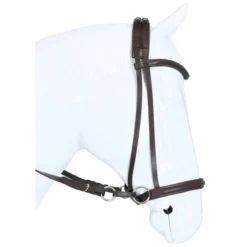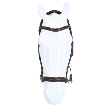 F.R.A. bitloos systeem 5: bitloze optomingen zijn niet nieuw! Eeuwenlang werd een bitloze optoming als vanzelfsprekend ervaren, voordat er ooit aan werd gedacht iets in de mond van het paard te stoppen legde de mens er simpelweg iets omheen. Een touw als halster was destijds voldoende en zo ontstond de eerste bitloze optoming. In combinatie met de ondersteunende gewichts-,been- en gevoelshulpen onderhoudt de ruiterhand via de teugels kontakt, niet met de mond, maar met het hoofd van het paard. Werkingsprincipe: druk op neus, nek èn wangen, nek/kingekruiste teugelvoering. Bouw: De lederen neusriem van deze optomingen, in de markt veelal bekend onder systeem Cook, is aan beide zijden even achter de bakstukken voorzien van een ring. Door deze ringen loopt een soepele lederen riem kruislings over de kin, via de kaken over de nek. Aan beide uiteinden van deze riem worden de gespen of clips van de teugeluiteinden bevestigd. Aan de linkerzijde van het hoofdstel vind je één gesp voor de bakstukafstelling en één gesp voor het verbinden van de kruislingse riemen. Ter bescherming van het nekgebied zijn beide riemen daar met een zachte padding onderlegd. De riemen dienen zodanig door de passanten van deze nekpadding verschoven te worden dat ze aan beide zijden gelijke lengte hebben. De gesp van de kinriem is de enige gesp die nodig is om het hooofdstel op het hoofd te fixeren. Ligging: Evenals bij de meeste bitloze optomingen geldt ook voor deze optomingen dat de neusriem op het harde gedeelte van de neus moet liggen, ongeveer daar waar het neusbeen begint. De kinriem mag gevoelsmatig ’te’ vast, maar beslist niet aangesnoerd zijn. Dit om verdraaiïng van het hoofdstel te voorkomen. De bakstukken van bitloze hoofdstellen met een kin- nekgekruist systeem zullen altijd de neiging hebben enigszins op te bollen. Inwerking: