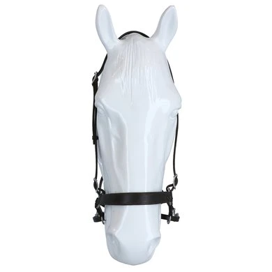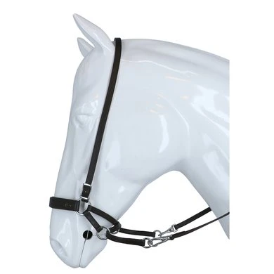 F.R.A. bitloos systeem 4: bitloze optomingen zijn niet nieuw! Eeuwenlang werd een bitloze optoming als vanzelfsprekend ervaren, voordat er ooit aan werd gedacht iets in de mond van het paard te stoppen legde de mens er simpelweg iets omheen. Een touw als halster was destijds voldoende en zo ontstond de eerste bitloze optoming. In combinatie met de ondersteunende gewichts-,been- en gevoelshulpen onderhoudt de ruiterhand via de teugels kontakt, niet met de mond, maar met het hoofd van het paard. Werkingsprincipe: druk op neus en wangen, kingekruiste teugelvoering. Bouw: In dit systeem eindigt de neusriem aan beide zijden met een ring waaraan de bakstukken en de beide kinkruisriemen zijn bevestigd. Deze riemen vinden hun kruisgeleiding door een ring aan het einde van een kort stukje leder dat op zich dan weer aan de ringen van de neusriem is bevestigd. Gevolg is dat het kruislingse geheel wat lager hangt dan bij kaakgekruiste optomingen (zie systeem 5). Aan de uiteinden van de kruisriemen worden de teugels bevestigd. Verder is dit hoofdstel eenvoudig in uitvoering door het ontbreken van een frontriem, een keelriem en de stoot en gesp die we normaal op een neusriem aantreffen. Aan de linkerzijde vind je een gespverbinding in het bakstuk, het is de enige gesp, die nodig is om het hoofdstel op maat te maken. Éénmaal op maat, dan schuif je het hoofdstel van dit systeem simpelweg op het paardenhoofd waarna je niets meer hoeft vast te maken. Voor de serie F.R.A.® katoenen hoofdstelen uit systeem 4 geldt in essentie het hier beschrevene, uiteraard is er in die lijn van hoofdstellen geen sprake van gespverbindingen of andere op leder betrekking hebbende omschrijvingen. Ligging: Evenals bij de meeste bitloze optomingen geldt ook voor de hoofdstellen uit systeem 4, dat de neusriem op het harde gedeelte van de neus moet liggen, ongeveer daar waar het neusbeen begint. De bijzondere bouw van deze hoofdstellen zorgen voor een goede en vaste ligging op het paardenhoofd zonder dat je iets behoeft vast te maken. Inwerking: De kingekruiste riemen zorgen ervoor dat wanneer je links of rechts vraagt, het paard druk aan de andere kant op neus en wang krijgt en vervolgens de hand van de ruiter volgt: wendingen dus als gevolg van druk. Gelijktijdige ophoudingen aan beide teugels sluiten de neusriem en geven mogelijkheden tot halthouden of tempowisselingen. Het genoemde vragen van linker, rechter of beide teugels zal door de indirecte teugelvoering altijd een bepaalde mate van dosering in zich hebben, het is deze dosering die de mate van discriminerende inwerking bepaald. Dit heeft tot gevolg dat een gewenste wijziging in de mate van discriminatie altijd in een vloeiend effect tot stand zal komen. Vanzelfsprekend worden teugelhulpen ondersteund met overige ondersteunende hulpen. Het verbindigsriempje dat de teugelgeleidering aan de neusriem en het bakstuk verbindt zorgt voor een lage ligging en vrije doorvoer van de kruislingse kinkruisriemen hetgeen de release zeer ten goede komt. Extra aandacht bij dit type hoofdstellen zal altijd moeten worden gegeven aan het onderhoud van de gekruiste kinriemen, het juiste onderhoud zal het leder de soepelheid geven om in de ringen de juiste release blijvend te kunnen ondervinden. Het hoofdstel leent zich niet tot longeren met de enkele longe en daardoor dus ook niet tot pessoa longeren. Voor het longeren aan de dubbele lijnen neemt u de teugels af en gebruikt u de vrijkomende ringen voor het bevestigen van de lange lijnen. Geschiktheid: De optoming wordt in combinatie met licht teugelcontact gebruikt en is zeer geschikt voor gevoelige paarden. Daardoor leent de optoming zich ook in het bijzonder voor in te rijden jonge paarden en hoog in het bloed staande gevoelige dieren, in die categorie is het hoofdstel ook als menhoofdstel te gebruiken. Naast dat het hoofdstel als leidhalster te gebruiken is geeft het tevens volledige mondvrijheid hetgeen op buitenritten zijn voordeel kan bieden.