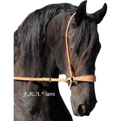F.R.A. bitloos systeem 4: bitloze optomingen zijn niet nieuw! Eeuwenlang werd een bitloze optoming als vanzelfsprekend ervaren, voordat er ooit aan werd gedacht iets in de mond van het paard te stoppen legde de mens er simpelweg iets omheen. Een touw als halster was destijds voldoende en zo ontstond de eerste bitloze optoming. In combinatie met de ondersteunende gewichts-,been- en gevoelshulpen onderhoudt de ruiterhand via de teugels kontakt, niet met de mond, maar met het hoofd van het paard. Werkingsprincipe: druk op neus en wangen, kingekruiste teugelvoering. Bouw: In dit systeem eindigt de neusriem aan beide zijden met een ring waaraan de bakstukken en de beide kinkruisriemen zijn bevestigd. Deze riemen vinden hun kruisgeleiding door een ring aan het einde van een kort stukje leder dat op zich dan weer aan de ringen van de neusriem is bevestigd. Gevolg is dat het kruislingse geheel wat lager hangt dan bij kaakgekruiste optomingen (zie systeem 5). Aan de uiteinden van de kruisriemen worden de teugels bevestigd. Verder is dit hoofdstel eenvoudig in uitvoering door het ontbreken van een frontriem, een keelriem en de stoot en gesp die we normaal op een neusriem aantreffen. Aan de linkerzijde vind je een gespverbinding in het bakstuk, het is de enige gesp, die nodig is om het hoofdstel op maat te maken. Éénmaal op maat, dan schuif je het hoofdstel van dit systeem simpelweg op het paardenhoofd waarna je niets meer hoeft vast te maken. Voor de serie F.R.A.® katoenen hoofdstelen uit systeem 4 geldt in essentie het hier beschrevene, uiteraard is er in die lijn van hoofdstellen geen sprake van gespverbindingen of andere op leder betrekking hebbende omschrijvingen. Ligging: Evenals bij de meeste bitloze optomingen geldt ook voor de hoofdstellen uit systeem 4, dat de neusriem op het harde gedeelte van de neus moet liggen, ongeveer daar waar het neusbeen begint. De bijzondere bouw van deze hoofdstellen zorgen voor een goede en vaste ligging op het paardenhoofd zonder dat je iets behoeft vast te maken. Inwerking: De kingekruiste riemen zorgen ervoor dat wanneer je links of rechts vraagt, het paard druk aan de andere kant op neus en wang krijgt en vervolgens de hand van de ruiter volgt: wendingen dus als gevolg van druk. Gelijktijdige ophoudingen aan beide teugels sluiten de neusriem en geven mogelijkheden tot halthouden of tempowisselingen. Het genoemde vragen van linker, rechter of beide teugels zal door de indirecte teugelvoering altijd een bepaalde mate van dosering in zich hebben, het is deze dosering die de mate van discriminerende inwerking bepaald. Dit heeft tot gevolg dat een gewenste wijziging in de mate van discriminatie altijd in een vloeiend effect tot stand zal komen. Vanzelfsprekend worden teugelhulpen ondersteund met overige ondersteunende hulpen. Het verbindigsriempje dat de teugelgeleidering aan de neusriem en het bakstuk verbindt zorgt voor een lage ligging en vrije doorvoer van de kruislingse kinkruisriemen hetgeen de release zeer ten goede komt. Extra aandacht bij dit type hoofdstellen zal altijd moeten worden gegeven aan het onderhoud van de gekruiste kinriemen, het juiste onderhoud zal het leder de soepelheid geven om in de ringen de juiste release blijvend te kunnen ondervinden. Het hoofdstel leent zich niet tot longeren met de enkele longe en daardoor dus ook niet tot pessoa longeren. Voor het longeren aan de dubbele lijnen neemt u de teugels af en gebruikt u de vrijkomende ringen voor het bevestigen van de lange lijnen. Geschiktheid: De optoming wordt in combinatie met licht teugelcontact gebruikt en is zeer geschikt voor gevoelige paarden. Daardoor leent de optoming zich ook in het bijzonder voor in te rijden jonge paarden en hoog in het bloed staande gevoelige dieren, in die categorie is het hoofdstel ook als menhoofdstel te gebruiken. Naast dat het hoofdstel als leidhalster te gebruiken is geeft het tevens volledige mondvrijheid hetgeen op buitenritten zijn voordeel kan bieden.