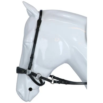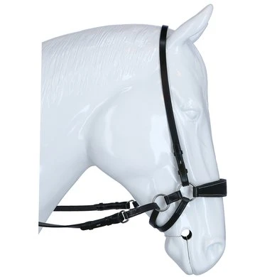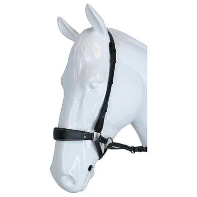 F.R.A. bitloos systeem 4: bitloze optomingen zijn niet nieuw! Eeuwenlang werd een bitloze optoming als vanzelfsprekend ervaren, voordat er ooit aan werd gedacht iets in de mond van het paard te stoppen legde de mens er simpelweg iets omheen. Een touw als halster was destijds voldoende en zo ontstond de eerste bitloze optoming. In combinatie met de ondersteunende gewichts-,been- en gevoelshulpen onderhoudt de ruiterhand via de teugels kontakt, niet met de mond, maar met het hoofd van het paard. Werkingsprincipe: druk op neus en wangen, kingekruiste teugelvoering. Bouw: In dit systeem eindigt de neusriem aan beide zijden met een ring waaraan de bakstukken en de beide kinkruisriemen zijn bevestigd. Deze riemen vinden hun kruisgeleiding door een ring aan het einde van een kort stukje leder dat op zich dan weer aan de ringen van de neusriem is bevestigd. Gevolg is dat het kruislingse geheel wat lager hangt dan bij kaakgekruiste optomingen (zie systeem 5). Aan de uiteinden van de kruisriemen worden de teugels bevestigd. Verder is dit hoofdstel eenvoudig in uitvoering door het ontbreken van een frontriem, een keelriem en de stoot en gesp die we normaal op een neusriem aantreffen. Aan de linkerzijde vind je een gespverbinding in het bakstuk, het is de enige gesp, die nodig is om het hoofdstel op maat te maken. Éénmaal op maat, dan schuif je het hoofdstel van dit systeem simpelweg op het paardenhoofd waarna je niets meer hoeft vast te maken. Voor de serie F.R.A.® katoenen hoofdstelen uit systeem 4 geldt in essentie het hier beschrevene, uiteraard is er in die lijn van hoofdstellen geen sprake van gespverbindingen of andere op leder betrekking hebbende omschrijvingen. Ligging: Evenals bij de meeste bitloze optomingen geldt ook voor de hoofdstellen uit systeem 4, dat de neusriem op het harde gedeelte van de neus moet liggen, ongeveer daar waar het neusbeen begint. De bijzondere bouw van deze hoofdstellen zorgen voor een goede en vaste ligging op het paardenhoofd zonder dat je iets behoeft vast te maken. Inwerking: De kingekruiste riemen zorgen ervoor dat wanneer je links of rechts vraagt, het paard druk aan de andere kant op neus en wang krijgt en vervolgens de hand van de ruiter volgt: wendingen dus als gevolg van druk. Gelijktijdige ophoudingen aan beide teugels sluiten de neusriem en geven mogelijkheden tot halthouden of tempowisselingen. Het genoemde vragen van linker, rechter of beide teugels zal door de indirecte teugelvoering altijd een bepaalde mate van dosering in zich hebben, het is deze dosering die de mate van discriminerende inwerking bepaald. Dit heeft tot gevolg dat een gewenste wijziging in de mate van discriminatie altijd in een vloeiend effect tot stand zal komen. Vanzelfsprekend worden teugelhulpen ondersteund met overige ondersteunende hulpen. Het verbindigsriempje dat de teugelgeleidering aan de neusriem en het bakstuk verbindt zorgt voor een lage ligging en vrije doorvoer van de kruislingse kinkruisriemen hetgeen de release zeer ten goede komt. Extra aandacht bij dit type hoofdstellen zal altijd moeten worden gegeven aan het onderhoud van de gekruiste kinriemen, het juiste onderhoud zal het leder de soepelheid geven om in de ringen de juiste release blijvend te kunnen ondervinden. Het hoofdstel leent zich niet tot longeren met de enkele longe en daardoor dus ook niet tot pessoa longeren. Voor het longeren aan de dubbele lijnen neemt u de teugels af en gebruikt u de vrijkomende ringen voor het bevestigen van de lange lijnen. Geschiktheid: De optoming wordt in combinatie met licht teugelcontact gebruikt en is zeer geschikt voor gevoelige paarden. Daardoor leent de optoming zich ook in het bijzonder voor in te rijden jonge paarden en hoog in het bloed staande gevoelige dieren, in die categorie is het hoofdstel ook als menhoofdstel te gebruiken. Naast dat het hoofdstel als leidhalster te gebruiken is geeft het tevens volledige mondvrijheid hetgeen op buitenritten zijn voordeel kan bieden.
