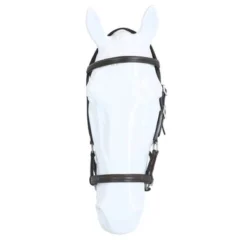 F.R.A. bitloos systeem 3: bitloze optomingen zijn niet nieuw! Eeuwenlang werd een bitloze optoming als vanzelfsprekend ervaren, voordat er ooit aan werd gedacht iets in de mond van het paard te stoppen legde de mens er simpelweg iets omheen. Een touw als halster was destijds voldoende en zo ontstond de eerste bitloze optoming. In combinatie met de ondersteunende gewichts-,been- en gevoelshulpen onderhoudt de ruiterhand via de teugels kontakt, niet met de mond, maar met het hoofd van het paard. Werkingsprincipe: druk op neus èn wangen, directe teugelvoering. Bouw: In systeem 3 kunnen we naast de F.R.A.® sidepull ook de diverse F.R.A.® knoophalsters onderbrengen. Sidepull: De lederen neusriem van deze eenvoudige optoming eindigt op beide wangen in een ring waaraan de kinriem en het bakstuk worden bevestigd. Aan een tweede ring op dezelfde plaats worden de teugels bevestigd hetgeen de teugelvoering verfijnt. Schuin verbindt een klein lederen riempje de neusriem nog eens extra met het bakstuk, dat houdt de neusriem netjes op zijn plaats en geeft de ruiter de mogelijkheid druk op de wang uit te oefenen.