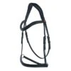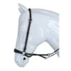 F.R.A. bitloos systeem 5: bitloze optomingen zijn niet nieuw! Eeuwenlang werd een bitloze optoming als vanzelfsprekend ervaren, voordat er ooit aan werd gedacht iets in de mond van het paard te stoppen legde de mens er simpelweg iets omheen. Een touw als halster was destijds voldoende en zo ontstond de eerste bitloze optoming. In combinatie met de ondersteunende gewichts-,been- en gevoelshulpen onderhoudt de ruiterhand via de teugels kontakt, niet met de mond, maar met het hoofd van het paard. Werkingsprincipe: druk op neus, nek èn wangen, nek/kingekruiste teugelvoering. Bouw: De lederen neusriem van deze optomingen, in de markt veelal bekend onder systeem Cook, is aan beide zijden even achter de bakstukken voorzien van een ring. Door deze ringen loopt een soepele lederen riem kruislings over de kin, via de kaken over de nek. Aan beide uiteinden van deze riem worden de gespen of clips van de teugeluiteinden bevestigd. Aan de linkerzijde van het hoofdstel vind je één gesp voor de bakstukafstelling en één gesp voor het verbinden van de kruislingse riemen. Ter bescherming van het nekgebied zijn beide riemen daar met een zachte padding onderlegd. De riemen dienen zodanig door de passanten van deze nekpadding verschoven te worden dat ze aan beide zijden gelijke lengte hebben. De gesp van de kinriem is de enige gesp die nodig is om het hooofdstel op het hoofd te fixeren. Ligging: Evenals bij de meeste bitloze optomingen geldt ook voor deze optomingen dat de neusriem op het harde gedeelte van de neus moet liggen, ongeveer daar waar het neusbeen begint. De kinriem mag gevoelsmatig ’te’ vast, maar beslist niet aangesnoerd zijn. Dit om verdraaiïng van het hoofdstel te voorkomen. De bakstukken van bitloze hoofdstellen met een kin- nekgekruist systeem zullen altijd de neiging hebben enigszins op te bollen. Inwerking: