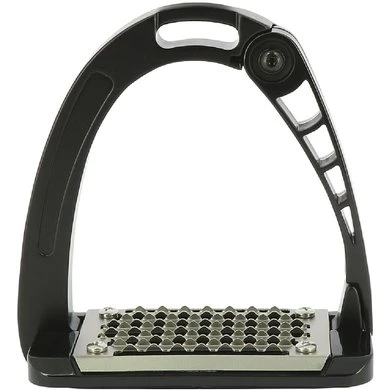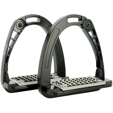 De nieuwe collectie stijgbeugels, junior, gemaakt van verschillende soorten materialen. Dit model is gepatenteerd en gaat aan de zijkant open bij een val dankzij een uniek HiFLex spannings geactiveerd vergrendelings- en ontgrendelingsmechanisme met een grote opening. De tak van de stijgbeugel is gemaakt van aluminium, terwijl de openingsmechanisme is gemaakt van een speciaal polyamide materiaal. De stijgbeugelsteunen zijn ook gemaakt van polyamide en de zolen van roestvrij staal. Nauwsluitende, zeer resistente en extra brede zolen voor maximale grip. Ontwikkeld en vervaardigd in Italië. Junior maat: 105 mm. Zolen: 10 x 6,5 cm. Junior Maximaal gewicht: 80 kg. Gewicht beugels: 703 g per paar. Maximale armopening: 90 mm.