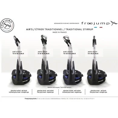De AIR’S STIRRUPS zetten een nieuw standaard in de wereld van traditionele stijgbeugels. Gemaakt van roestvrij staal, met een vloer gemonteerd op luchtkussen, wordt de AIR’s-stijgbeugel geleverd met een volledige aanpassing van de technische keuzes: oogoriëntatie en / of helling van de vloer. De bovenste polyamide hoofdband is ontworpen om te activeren in geval van hoge druk om zo nodig het loslaten van de voet te vergemakkelijken. De kleuren van de stickers, de vloer en het elastomeer zijn aanpasbaar voor een unieke look.