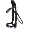 Luxe lederen S&T hoofdstel met aansnoerneusriem. De luxe, brede lak-neusriem is 4CM breed (incl. witte padding) en is anatomisch gevormd rond het bit. Met speciaal, anatomisch, zacht onderlegd kopstuk. Elegante smalle riempjes voor onder andere de keelriem. Uitgevoerd met luxe, hangende frontriem met lak en schitteren