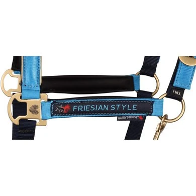 Halster bekleed met satijn en onderlegd met neopreen, piping op de neus, Friesian Style logo op de zijkant, pompeblad laserprint op de buckles, ogen voorzien van metalen ringen, verstelbaar aan 2 kanten van het kopstuk en op de kin, inclusief luxe touw