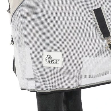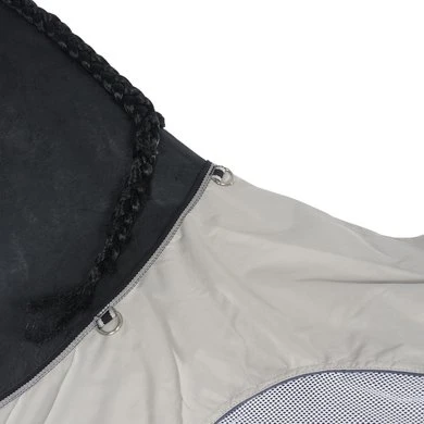 Vliegendeken voor een regenachtige dag, met afneembare hals met waterdichte rug en bovenkant van de afneembare hals, twee snelsluitingen aan de voorkant en twee klittenband sluitingen aan de hals, de hals is afneembaar dmv D-ringen, twee kruissingels, twee elastische afneembare bilkoorden en een staartflap. 100% polyester 600D PU coating on back