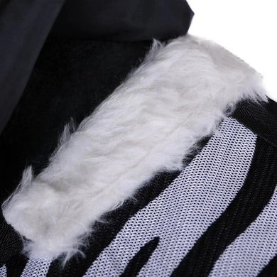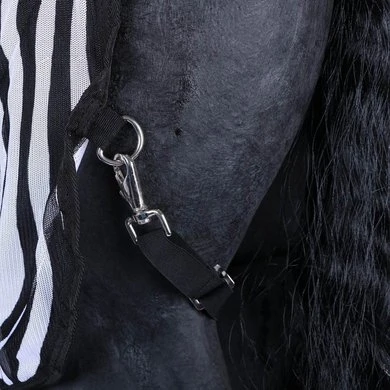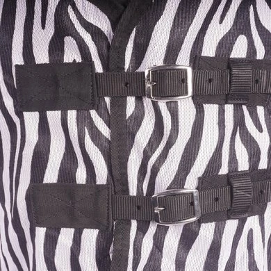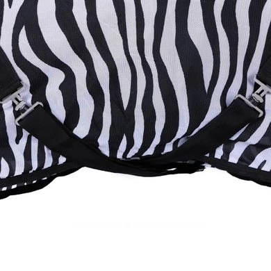 De Harry’s Horse vliegendeken met losse hals is gemaakt van een soepel en sterke “mesh” (100% polyester) en is verkrijgbaar in zebra print. De hals is afneembaar doormiddel van clipsluitingen. De deken heeft dubbele gespsluitingen op de borst, kruissingels onder de buik, een schoftbondje en afneembare bilriemen. Daarnaast heeft de deken een extra lange staartflap.