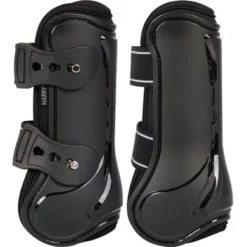 Prachtige peesbeschermers met een perfecte pasvorm. Met sterke, elastische sluitingen. Door de speciale knopsluiting is er geen klittenband nodig. De ventilatiegaten in de schaal zorgen in combinatie met het air-neopreen voor ventilatie en beluchting. Door de optimale pasvorm heeft het paard veel bewegingsvrijheid. De TPU buitenschaal beschermt tegen aantikken en heeft een extra verdikking op de pees en op de kogel voor extra bescherming. Lengte schaal achterzijde: 15cm (17,5cm incl. neopreen). Dikte neopreen: 5,5mm.
