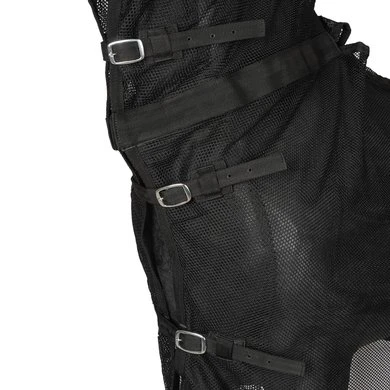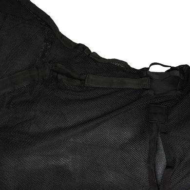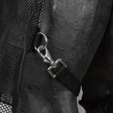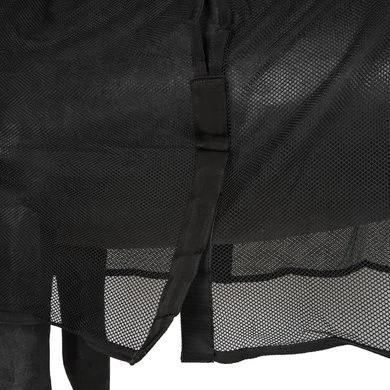 Het deken is ontworpen zodat u het erop kunt leggen en eraf kunt halen zonder het tuig los te maken! Het deken is gemaakt van katoen mesh stof en heeft 3 gesp sluitingen op de borst/hals, bil riemen en een staart koord. Doormiddel van stevige klittenband in de hals,schoft en bij de lamoen opening is het deken geheel los te maken zonder dat u het tuig los hoeft te maken.