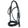 Dit stang en trens hoofdstel is uitgevoerd in special soft leder, met ss fournituren met blinde sluitingen aan bakstukken en teugels. Het kopstuk is zacht gevoerd en terug gesneden. Met anatomische lak neusriem 4cm breed en white glitter stone frontriem.