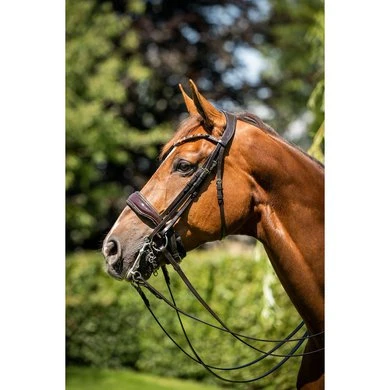 Dit stang en trens hoofdstel is speciaal ontwikkeld met een anatomisch zacht onderlegd en terug gesneden kopstuk. Dit kopstuk is zo gevormd om de druk achter de oren en op het hoofd te verlagen. De neusriem is nog beter anatomisch gevormd hierdoor is de pasvorm nog beter, en verlaagd de druk op de neus. De frontriem is speciaal vervaardigd met grote swarofski stenen. De neusriem is versiert met siersteentjes. Wordt geleverd met 2 lederen teugels.
