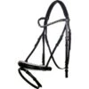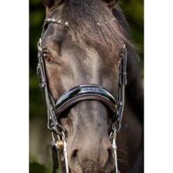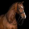 nog beter anatomisch gevormd hierdoor is de pasvorm nog beter, en verlaagd de druk op de neus. De frontriem is speciaal vervaardigd met grote swarofski stenen. De neusriem is versiert met siersteentjes. Wordt geleverd met 2 lederen teugels.