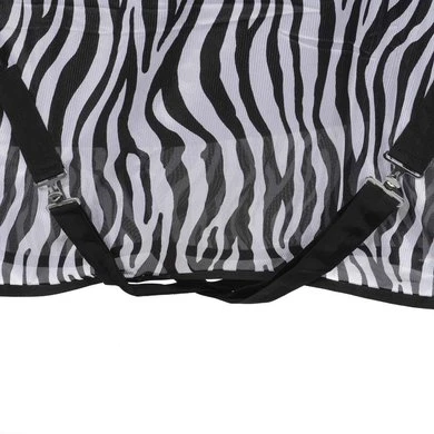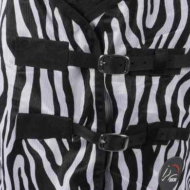 De HKM vliegendeken Zebra is extreem winddoorlatend en duurzaam. De deken is voorzien van metalen borstsluiting, dubbele borstsluiting, buikflap, staartriem, staartflap en extra lange zijkanten. De stof is van hoogwaardige kwaliteit, 100% polyester. De deken is onderhoudsvriendelijk. De zebraprint vermindert de hoeveelheid aanvliegende insecten. Wasmachinebestendig tot 30 graden, mag in de droogtrommel.
