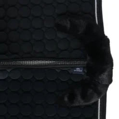 Fluweelachtig zadeldek met chic quiltpatroon. Zacht imitatiebont op de schoft en bovenop de achterkant van het zadel. Chique gedraaide koorden langs de bies. Rijkelijk verfraaide badge met borduurwerk en steentjes.