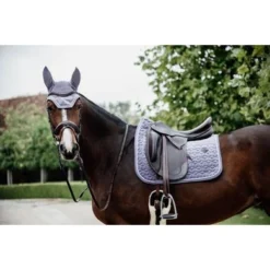 Het Kentucky Horsewear oornetje Fly Veil Velvet is met de hand gemaakt en afgewerkt met velvet details. Dit oornetje beschermt de oren van het paard tegen vliegen tijdens het rijden. Het materiaal rond de oren rekbaar en sluit mooi aan voor een perfecte pasvorm. Het nekstukje is langer waardoor het oornetje blijft zitten en niet wegglijdt. Er werd geen zichtbaar logo op geborduurd waardoor de ruiter of sponsor zijn eigen logo kan plaatsen. Alleen met de hand wassen.