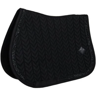 Dit zadeldoek Glitter Stone met visgraat patroon waarbij de rand is afgewerkt met glitter steen heeft een schok dempende functie tussen de rug van het paard en het zadel en vermijd mogelijke wrijving. Dit stijlvol zadeldek heeft een uniek patroon met daarop het Kentucky-logo. Dankzij de goede pasvorm is er bovenaan geen lus aanwezig om het zadel vast te maken, enkel een lus voor de singel. Uitstekende demping, beschermt tegen wrijving. Machine wasbaar op 30°, geen droger. Om beschadiging aan de parels te voorkomen, wordt het aangeraden een waszak te gebruiken.
