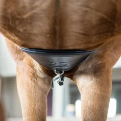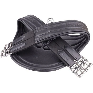 Buikbeschermersingel van leer met zacht gevoerde noppenbescherming, elastische inzetstukken aan beide zijden, ringen voor hulpteugels en centrale D-ring voor bevestiging van het borsttuig.