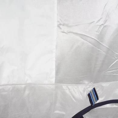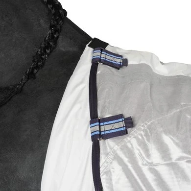 Een super lichtgewicht vliegendeken voor bescherming tijdens de warme dagen. Innovatief antibacterieel en antistatisch micromesh zorgt ervoor dat de deken aanvoelt als een tweede huid en optimaal ademend is. Het reguleert de temperatuur van het paard terwijl het een stevige barrière vormt tegen vliegen, muggen en dazen. De extra grote buikflap met 3 sluitingen beschermt de buik en zorgt er tegelijkertijd voor dat de deken altijd op zijn plek blijft, terwijl de lange staartflap de staart en achterbenen beschermt. De voorsluiting van de deken heeft een lichte hoek die de druk op de borst van het paard verdeelt en daardoor vermindert. Het gepatendeerde onafhankelijke zijdeel onderaan de deken zorgt voor een onderbreking in de zoomlijn, waardoor de bewegingsvrijheid van het paard wordt vergroot en de druk wordt verminderd