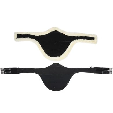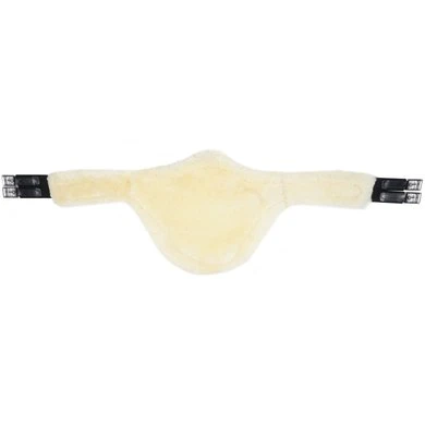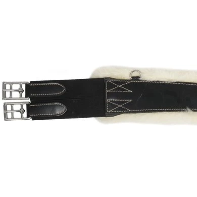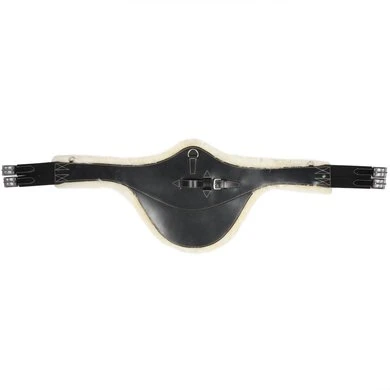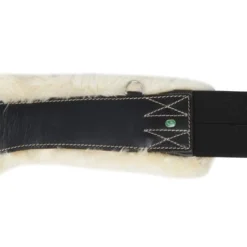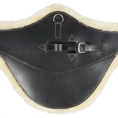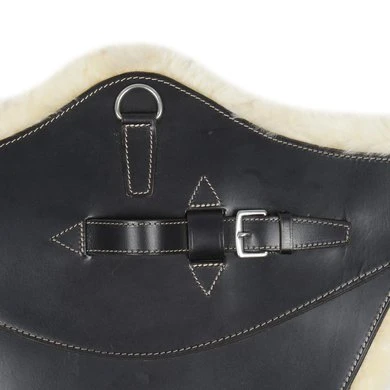 Lederen singel met buikflap afgewerkt met sierstiksel en afneembare echte schapenvacht die bevestigd is met velcro. Rolgespen die aan beide zijden bevestigd zijn op 3-voudige elastiek. Voorzien van 2 d-ringen aan de zijkanten en een sterke d-ring en lederen lus met gesp in het midden voor bevestiging van martingaal of hulpteugels.