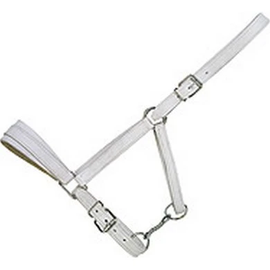 Van wit chroom buffelleder, volledig met nylon verstevigd, verstelbare, brede neusriem en kopstuk. Gespwerk en kinriem/keelriem verbinding van vernikkeld staal.