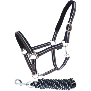 Halster van dubbeldik nylon met verstelbare neusriem en kopstuk, gevoerd met neopreen. Snelsluiting aan de keelriem. Gespen van chroom of roségoudkleurig metaal. Wordt geleverd met een halstertouw van 2,50 m.
