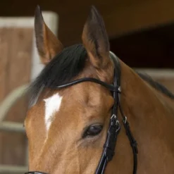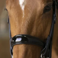 Hoofdstel, kopstuk en neusriem van buffelleer met Pullback sluiting, gevoerd met rundleer. Frontriem, bakstukken, kopstuk, neusriem en keelriem van rond genaaid leer. Glanzende neusriem met krokodillenmotief. Zwarte stiksels. Beide bakstukken met blinde sluiting. Roestvrij stalen gespen. Geleverd zonder teugels.