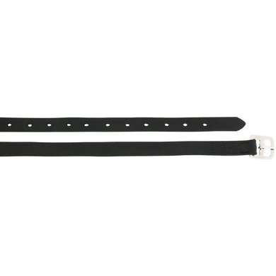Synthetische stijgbeugelriemen versierd met gekleurd nylondraad. Roestvrij stalen gespen. Samenstelling: PVC.