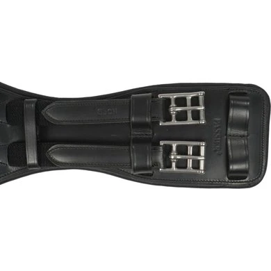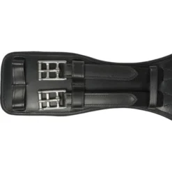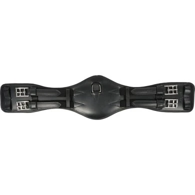 De gebogen lederen zadelsingel met elastische uiteinden aan beide zijden heeft een D-ring in het midden voor het bevestigen van extra teugels en garandeert een optimale bewegingsruimte voor het paard. Het verbrede riemcentrum zorgt voor een optimale drukverdeling. De zadelband heeft aan beide zijden twee extra lipjes voor een optimale omsnoering!