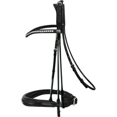 De zijkanten en de keelriem van het prachtige Icarus hoofdstel zijn rond genaaid. Nu nieuw met paardvriendelijke anatomisch gevormde en gevoerde hoofdbanden en anatomisch gevormde, zacht gevoerde neusriem met lak. De gebogen frontriem met sprankelende Clear Crystal Swarovski Elements maakt de elegante look af. Dit stang & trens hoofdstel wordt standaard geleverd met 2 glad leren teugels die aan het begin rond genaaid zijn waarvan de trens teugel aan de binnenkant is voorzien van fijn stroef rubber.