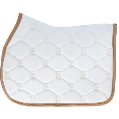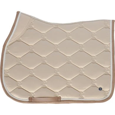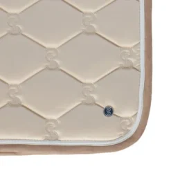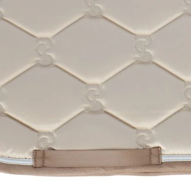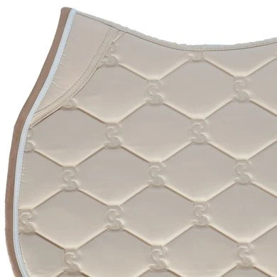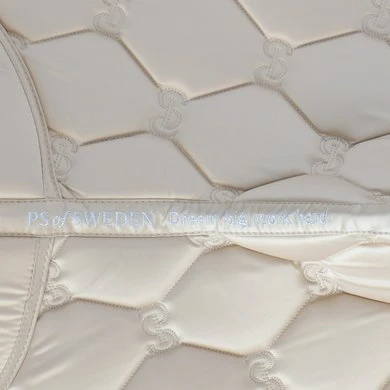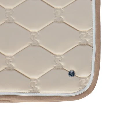 Anatomisch gevormd zadeldek met doorgestikt PS-monogram, suède bies en zadelsingelbescherming. Onze zadeldekjes hebben extra ruimte aan de zijkanten en onze unieke stop-kussens die het zadeldek op zijn plaats houden onder het zadel. Onderkant is van Quick-Dry materiaal dat vocht transporteert en antibacterieel is.
