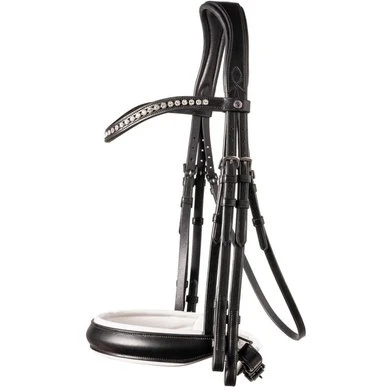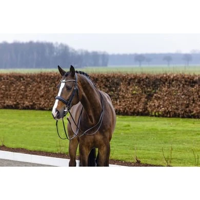 Het stang en trens hoofdstel TRUST Wellington is een klasse apart. Het stijlvolle hoofdstel heeft een prachtige afwerking en een mooie pasvorm. De TRUST Wellington heeft een anatomische aansnoerneusriem die versterkt is met nylon om uitrekken te voorkomen. De neusriempadding loopt verder door dan de neusriem zodat de gespen nooit het hoofd van het paard kunnen raken. De frontriem is voorzien van de zuiverste kwaliteit Stellux™ steentjes wat zorgt voor een elegante uitstraling. Deze steentjes zijn deep-set, waardoor ze er niet uitvallen. Het kopstuk is anatomisch gevormd en teruggesneden voor meer vrijheid bij de oren. De padding van het kopstuk is zacht maar niet te dik, zodat er direct contact is met paard. De TRUST Wellington is een musthave hoofdstel voor de dressuurruiter!