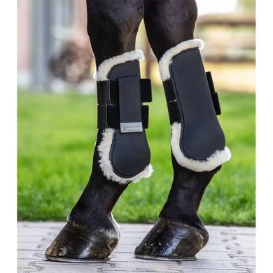 De perfecte symbiose van natuurlijke lamshuid en schokabsorberende, anatomisch gevormde buitenschaal. Brede banden met klittenband zorgen voor een veilige grip op de benen van het paard