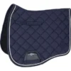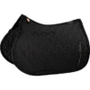Kwaliteitszadeldek van glanzend buitenmateriaal. Opvallend is ook het zilverkleurige metalen logo en het glinsterende koord. In het zadelgedeelte bevinden zich drie siliconenapplicaties die voorkomen dat het zadel wegglijdt. Er kan gekozen worden voor een enkele of een onderverdeelde stijgbeugelriemlus.