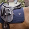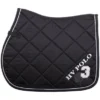 Kwaliteitszadeldek van glanzend buitenmateriaal. Opvallend is ook het zilverkleurige metalen logo en het glinsterende koord. In het zadelgedeelte bevinden zich drie siliconenapplicaties die voorkomen dat het zadel wegglijdt. Er kan gekozen worden voor een enkele of een onderverdeelde stijgbeugelriemlus.