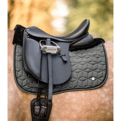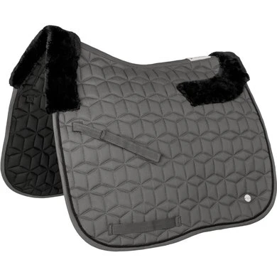 Sportief zadeldek met zwart kunstbont op de schoft en de achterkant. De opvallende stiksels, het zwarte sierkoord en de zilverkleurige metalen plaat ronden het zadeldek perfect af.